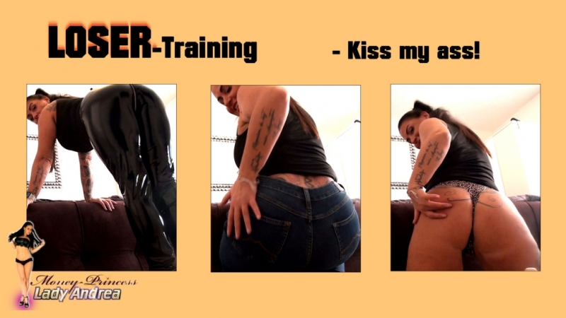 Ja Loser, es ist allerhöchste Zeit für ein neues Training. Here it is! Nur nicht aus der Übung kommen, du Lappen! Meine Marionetten haben schließlich zu funktionieren! Deine heutige Lektion lautet: Küss meinen göttlichen Po! Und zwar in Lack, Jeans und auch nur im Tanga. Du wirst dich wirklich sehr kontrollieren müssen, nicht zu Spritzen! Jedoch verlange ich, dass die Fotze trocken bleibt, Sklave! So schwer es auch erscheinen mag, du reißt dich zusammen. Und wehe du Stück Scheisse kommst! Bete diesen göttlichen Prachtarsch an, küsse ihn und wichse dabei. Dieses Training ist täglich zu absolvieren!